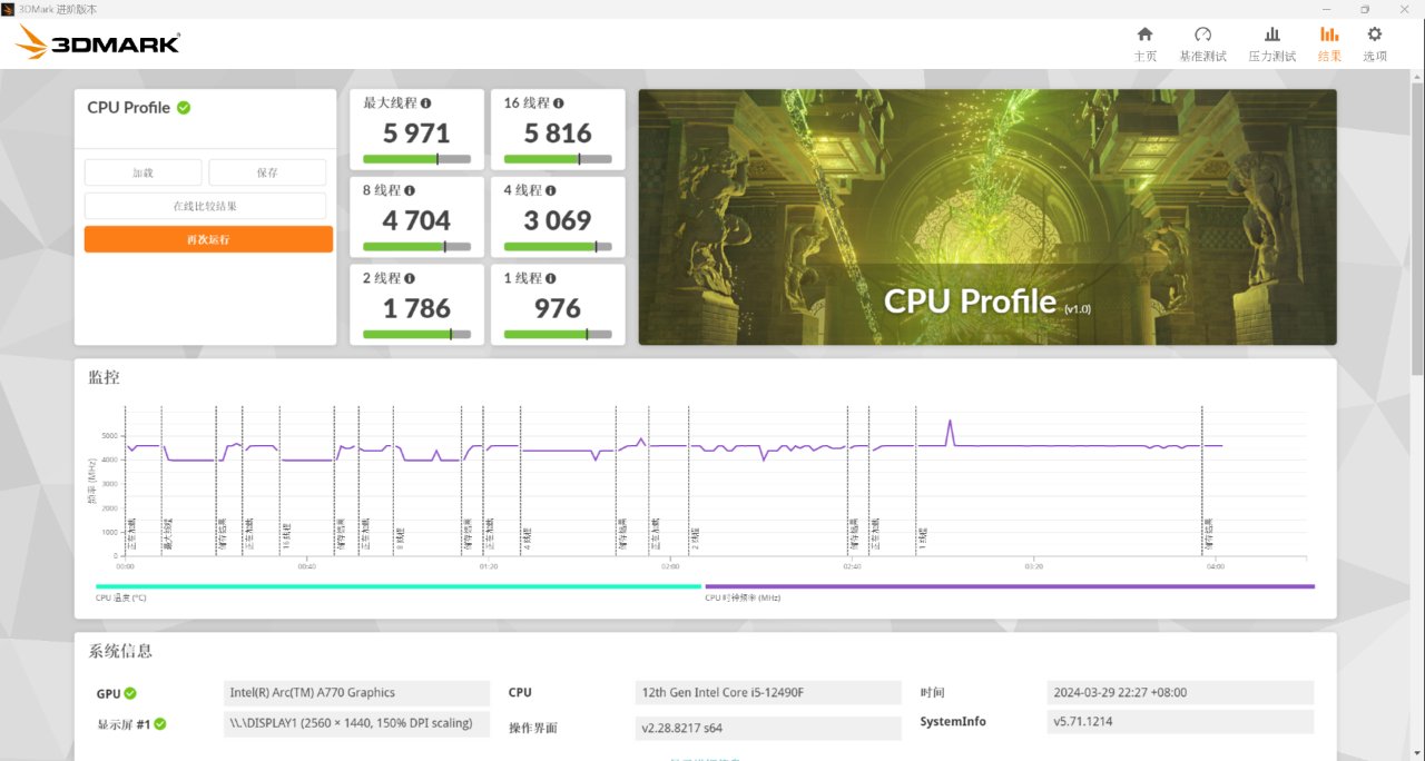 使用 3DMark 的 CPU Profile 基準測試,默認情況i5 12490F單線程得分976分,最大線程得分5971分: