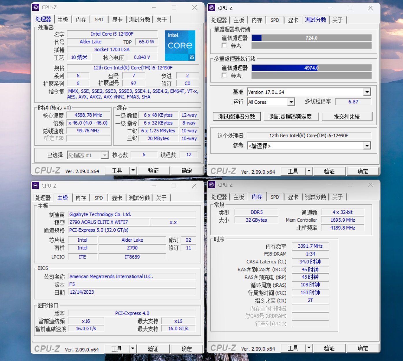 首先通過 CPU-Z 來測試下處理器分數,我手上的i5 12490F默認狀態下單核得分 724 分,多核得分4974分。
