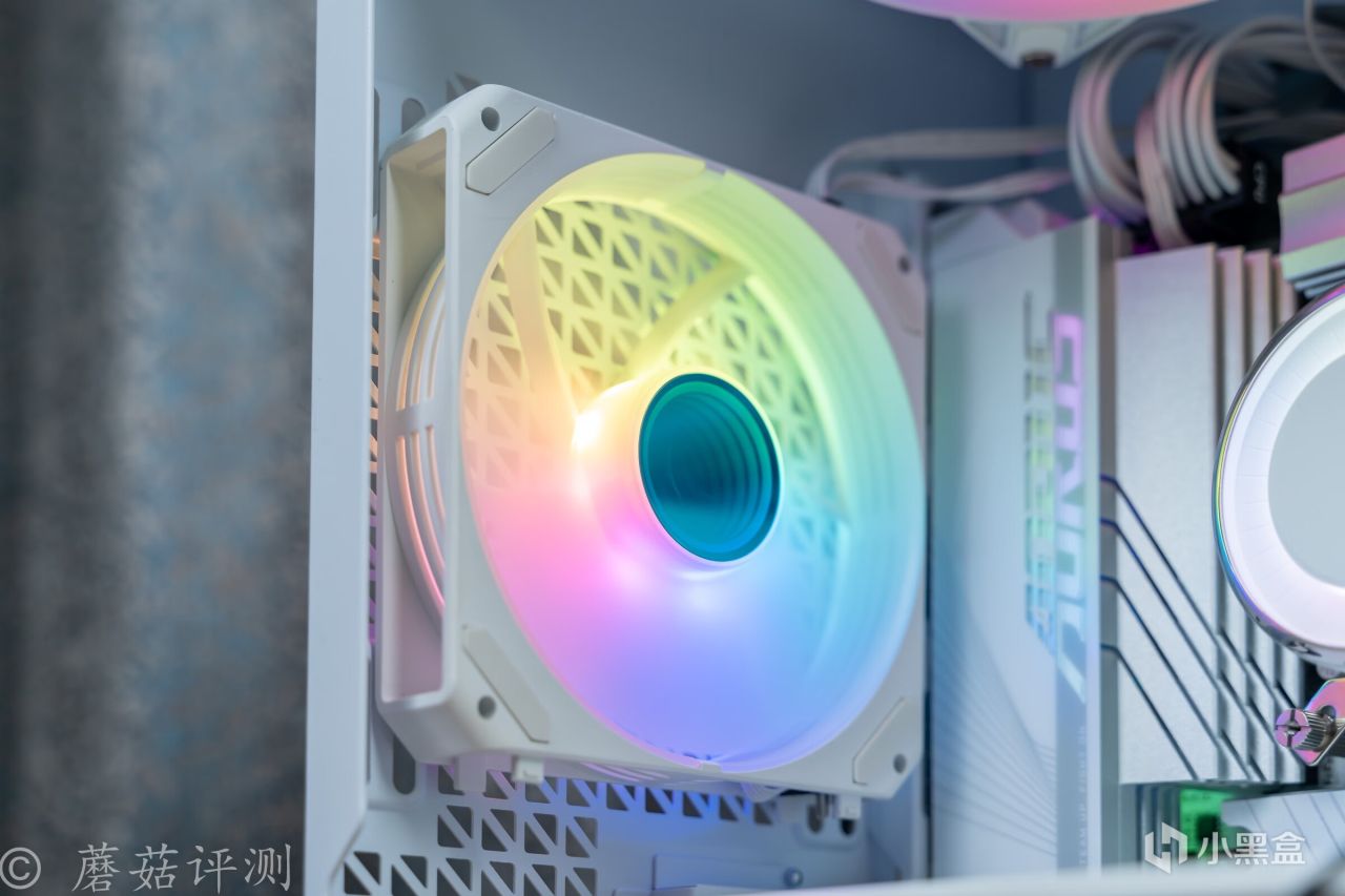 ▼機箱風扇用的是喬思伯的ZG120W,這款風扇的ARGB燈效很豐富,扇葉是乳白色的,有柔光效果,中間有千層鏡設計,側面也設計有多條乳白色的燈帶。