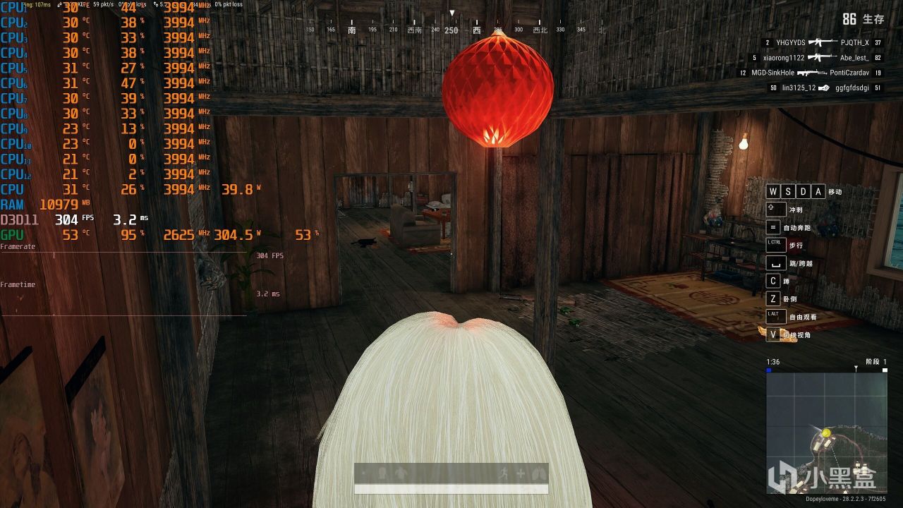 ▼室內遊戲幀數略低一點,304幀左右,顯卡佔用95%,也沒啥問題。
