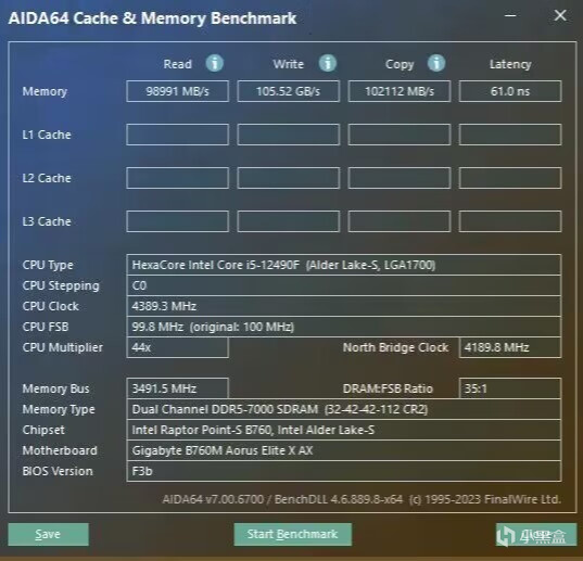 ▼簡單跑下內存的讀寫測試,成績非常優秀,內存讀取速度98991MB/s、寫入速度105.52GB/s、複製102112MB/s,延遲61ns。