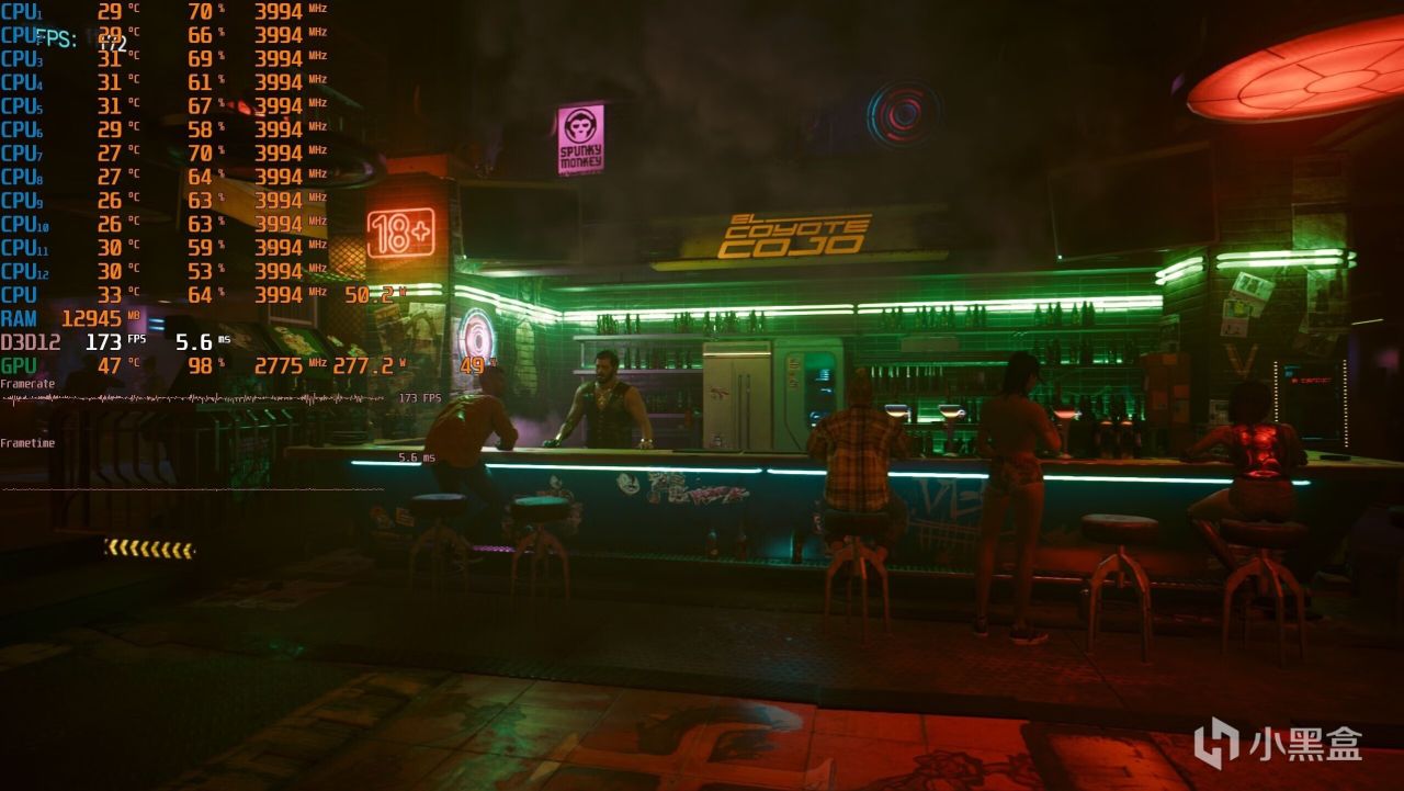 ▼吧檯遊戲幀數在173幀左右,非常流暢,顯卡佔用98%,表現不錯。