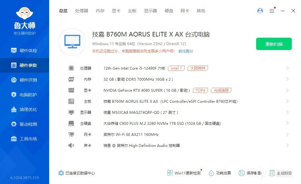 ▼整機配置一覽,處理器是12490F,主板是技嘉的B760M AORUS ELITE X AX冰雕X,內存是影馳的HOF PRO DDR5 16GB*2 7000MHz,顯卡是影馳的RTX4080 Super星曜OC,整機配置很給力。