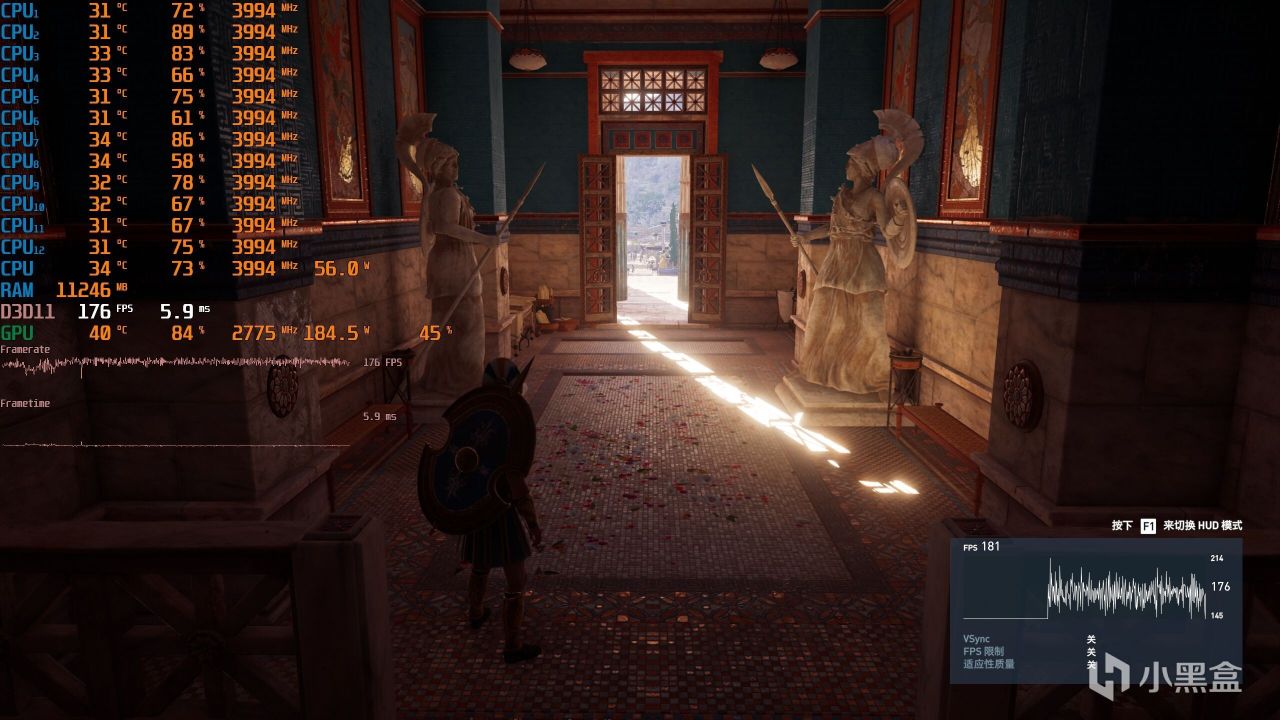 ▼衆生平等奧德賽,2K分辨率,全極高畫質,體積雲最低,走廊遊戲幀數176幀,非常流暢。