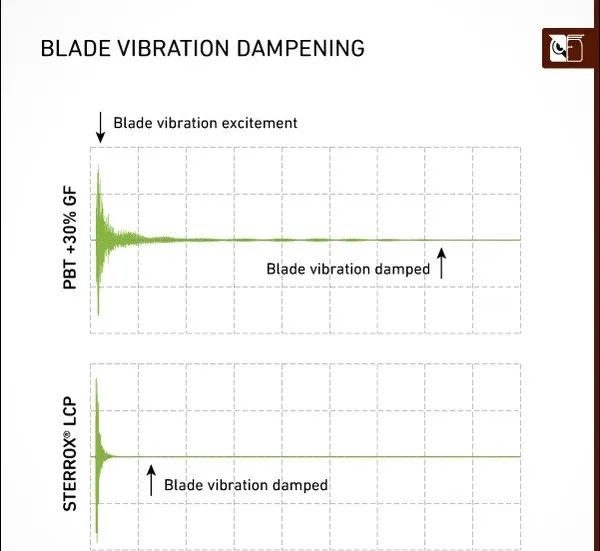 用作扇葉材質時,LCP材料不但能依靠極高的強度縮小框葉間距,還能借此更迅速地抑制振動雜音。LCP材質風扇的噪音通常更加貼合人耳聽感——這是傳統塑料所比不上的。